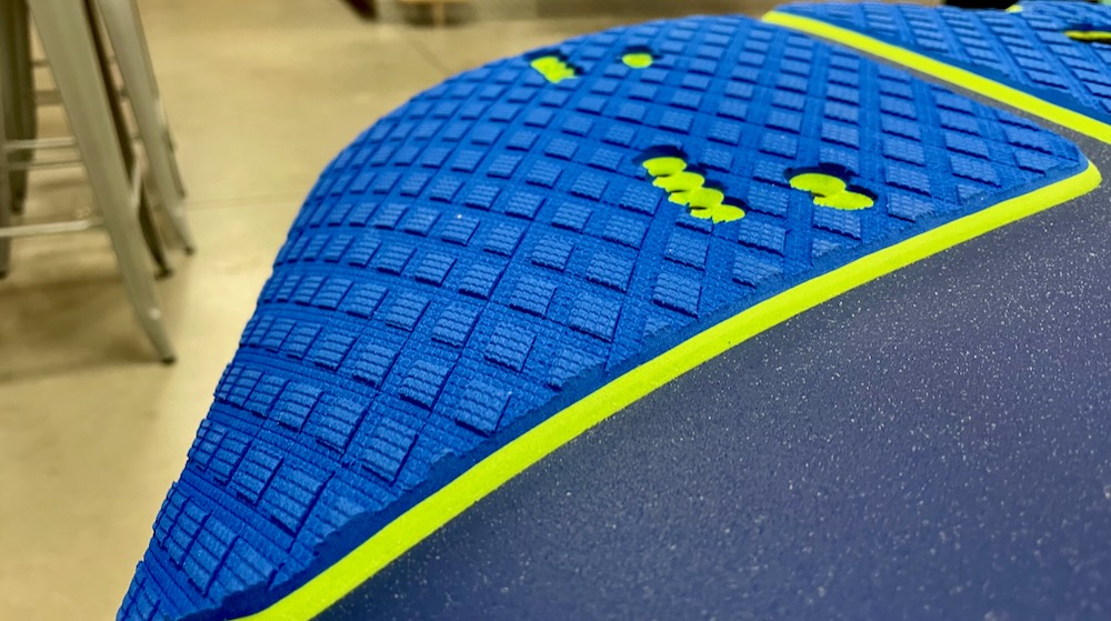 - un volume mieux réparti avec plus de largeur sous le pied arrière pour mieux matcher avec les foils actuels, mais en restant peu épais pour ne pas avori à recourrir à des foils ultra-raides (donc chers)