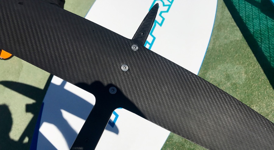 Dans le vent soutenu (20knt en 7m2), l’aile fini par pousser beaucoup et il devient plus compliqué de rester dans l’eau. Bien sûr, des grands techniciens comme Julien Bontemps et Damien Le Guen arrivent à bloquer l’ensemble à la contre gîte pour le pousser plus loin (j’ai vu Julien dans 30knt en 7m2 !), mais le commun des mortels n’y parviendra pas aussi aisément. Dans la configuration standard et pour un niveau moyen comme le mien, la limite haute de vent en 7m2 doit se situer autour de 18 knt environ si on veut rester 'facile'. Au delà, il faut soit passer à une taille de voile plus petite, soit reculer l’aile. Et oui, pour rester dans le principe de la monotypie (1 flotteur, une voile), les développeurs du concept RSX ont choisi d’offrir la possibilité de modifier la position de l’aile avant sur le fuselage. En reculant l’aile, on ne diminue pas la portance de l’aile, mais on limite le côté ardent du foil qui nécessiterai de pousser fortement sur le pied avant. Cela produit le même effet que si on avançait les straps … et on peut dire que c’est très efficace (et rapide) !