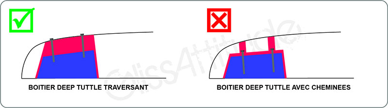 - Boitier : la plupart des foils nécessitent un boitier d’aileron type deep tuttle. Idéalement, on préfèrera des boitiers traversant (qui viennent jusqu’au pont de la planche, sans ‘cheminées’ pour mettre les vis) car ils favorisent une reprise des efforts sur le pont et simplifient l'installation du foil
