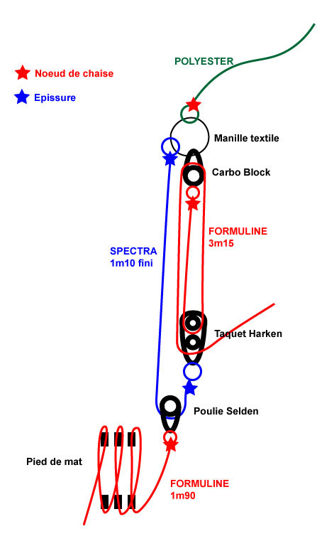 - une poulie carbo bloc Harken (ultra légère, ne peux pas abîmer le mat ou la voile)