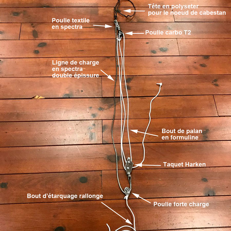 Vous pouvez les acheter au détail (Poulie forte charge, Poulie carbo T2, Taquet Harken, Formuline, Ligne spectra, bout polyseter), ou en kit tout fait (version pro, version eco), ou encore tout monté (je vous fabrique le palan avec la manille textile, les épissures etc. ... prêt à l'emploi)